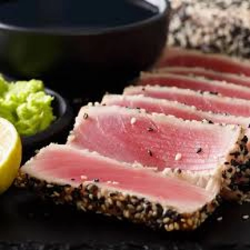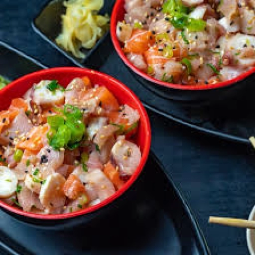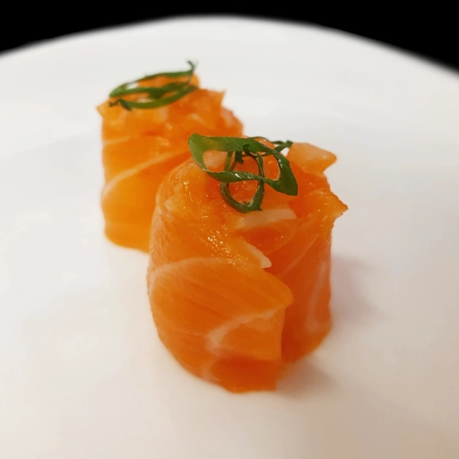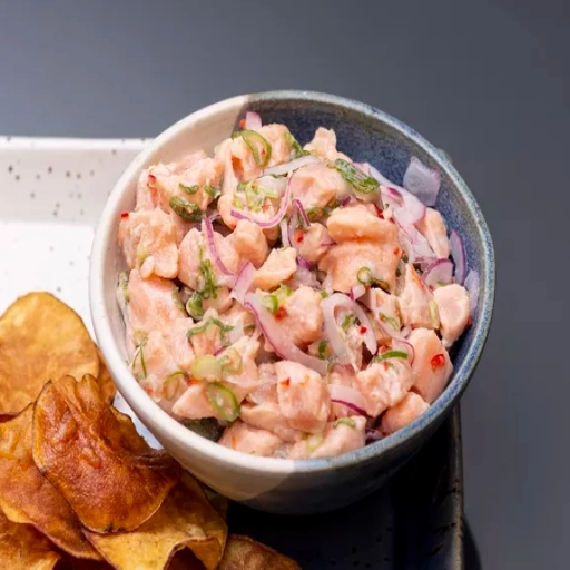 Salmão marinado no limão, cebola roxa, pimenta biquinho, gergelim e salsinha.