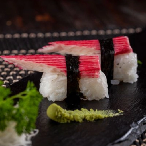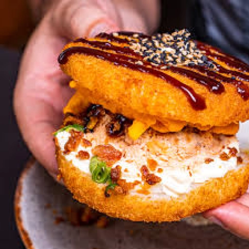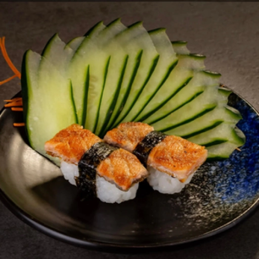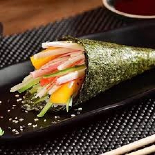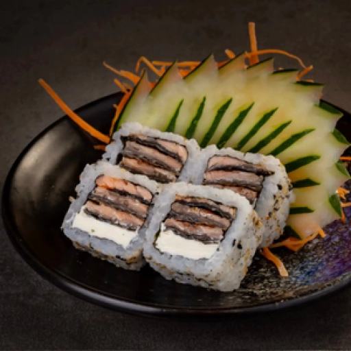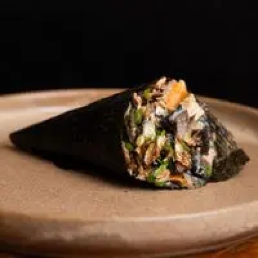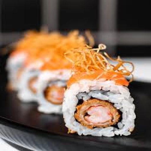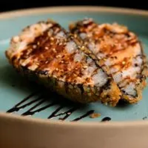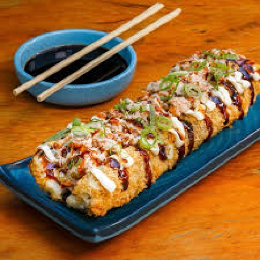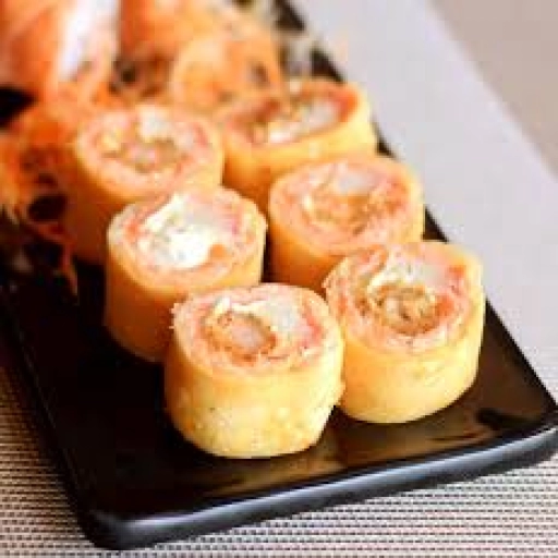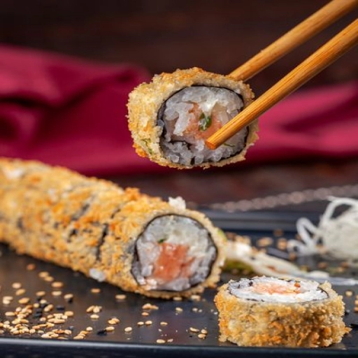 Alga envolvida com arroz, recheada com salmão e creme cheese, empanada com farinha panko |