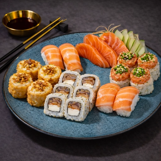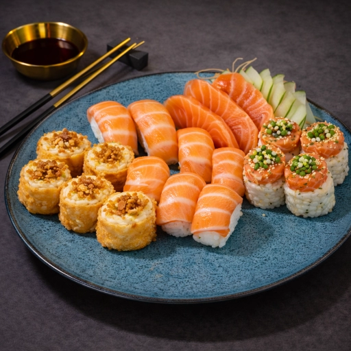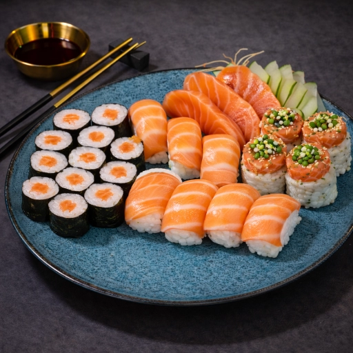 12 hot salmão / 10 hossomaki / 10 uramaki / 6 sushi salmão / 6 sashimi salmão / 6 joy salmão