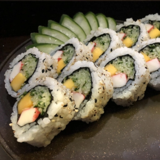 Arroz, salmão, haddock, sunomono, couve crispy, cream cheese, alga, manga, gergelim.