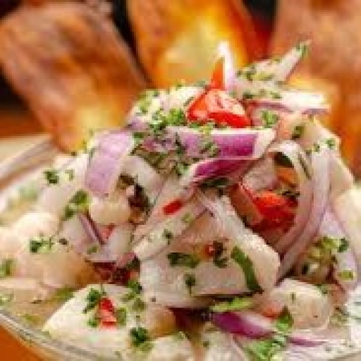 Peixe branco marinado no limão, cebola roxa, pimenta biquinho, gergelim e salsinha.